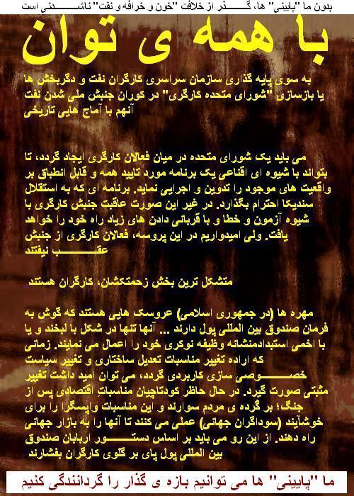 مي توان از بازخواني سه شکست تلخ تاريخي، ناکامي انقلاب مشروطه و سرکوبي جنبش ملي شدن نفت و کجراني انقلاب مردمي بهمن، جلوگرقت، اگر که کارگران و رنجبران و دادخواهان هشيارانه تر پيش تازند ....................................... از مورالس، کارگر کامياب بوليوي که سودآورترين بخش هاي افتصادي را به مالکيت همگاني درآورد و راه را به ديگر کارگران جهان نشان داد: به وجود آوردن رهبران جديد نياز به هدايت و رهبري زيادي دارد. (من) اين کارها را مي کردم، در اختيار گذاشتن تجربه ي مبارزه ي سنديکايي ام، و نيز تجربه ام در مبارزه ي انتخاباتي و اداره ي دولت. سياست (مردمي) علمِ خدمت، تلاش، تعهد، و فداکاري براي اکثريت و بينوايان است. بديهي است که سياست، مبارزه اي ميان منافع گوناگون و متفاوت است. و چيزي که ما را از ديگران متمايز مي کند اين است که ما براي منافع مشترک، منافع جمعي، به نفع تهي دستان مبارزه مي کنيم. مبارزه ي ما براي تمرکز سرمايه در دست تعدادي اندک نيست، بلکه بازتوزيع ثروت است به طوري که حدّي از برابري، عدالت اجتماعي، و صلح همراه با برابري و عزت و عدالت اجتماعي تأمين و تضمين شود. ما بايد از نظام سرمايه داري دست مي کشيديم. در اين نظام جنبش هاي اجتماعي را تروريست مي نامند، و در آن قرار نيست که اتحاديه هاي صنفي و کارگري در سياست وارد شوند. اما ما گفتيم که ما حقوق سياسي داريم و نمي توانيم فقط اتحاديه هاي صنفي و کارگري باشيم و فقط به خواست هاي صنفي کارگران بپردازيم. اگر خواهان دگرگوني هاي عميق هستيم، ايجاد دگرگوني هاي عميق در ساختارهاي دولتي (افزوده ما: ساختارهاي زمامداري) نيز اهميت مي يابد. تا حدودي با کارگراني مشکل داشتيم که بر استقلال اتحاديه صنفي و کارگري و موضع غيرسياسي آن پافشاري مي کردند. مدرسه من مبارزه سنديکايي، مبارزه اجتماعي، مبارزه در ميان جامعه بود ....................................... آزمون هایِ پارینی و کنونیِ جنبش هایِ کارگری-مردمی در چارگوشِ جهان، از آن میان در امریکایِ لاتین نیز، و از آن دست در بولیوی نیز، نمایانگر آنند که نه تنها در کورانِ پیروزیِ بازه ای بر بورژوازی، بلکه پیش و پس از آن نیز می بایست بر گردآوریِ نیروهایِ راستینِ پشتیبانِ "پایینی" ها پای فشرد، بویژه با دراندازیِ خواست هایِ بسیارِ روشنِ بازه ایِ اقتصادی در راستایِ خلعِ مالکیتِ دَرنده ترین و خطرناکترین و پُرترفندترین دشمنانِ "زمین و کارگران" از سویی، و برنامه ریزیِ حساب شده برای چیرگی بر برجسته ترین گلوگاه هایِ اقتصادی-اجتماعی-فرهنگی-امنیتی از دگرسویی ....................................... چگونگیِ همکاری با سازمان ها و نهادها و سخنگوهایِ خرده بورژوازی و بورژوازیِ کوچک-میانه ی ناکمپرادور در جنبش هایِ ملی-دمکراتیک و انقلاب هایِ برخاسته از آن، چه آیینی و چه ناآیینی، وابسته بوده و هست به برخوردِ آنان به خواست هایِ اقتصادی-اجتماعیِ لایه هایِ "پایینی"، بویژه به درخواست هایِ کارگران. جنبشِ کارگریِ ایران درخواست ها و خط قرمزهایِ مرحله ایِ خود را در بیانیه هایِ گوناگون، بیشاکم روشن، دست رسانده است. ما در کتابِ "خیزشِ هشتاد و هشت"، فشردگون آماج ها و خواست هایِ در راستایِ واگَردانیِ بنیادیِ زیر را، که نیز می توانند زمینه ای گردند برایِ گردآوریِ نیروهایِ ملی-دمکراتِ راستین، برجهانده ایم: "بازپس گرفتن دارایی های ملی زیردستِ خودی ها با پایوَری و اتکا بر قانون اساسی، باشاندن و ایجاد کردن شرایط برابر مالی برای همه ی آیین ها و تامین مالی آنان تنها از راه باورمندانشان، آمادن فهرستی از دارایی های ملی تاراج شده از سوی دست اندرکاران رژیم و دستیاران درون و برون مرز آنان برای بردن به دادگاه های درمرزی و فرامرزی (همانند رَقبات نادری که کاربُردیِ سیصد ساله داشت و جایگاه اقتصادی-اجتماعی دین سالاران را درازگاه فروکاست)، از میان برداشتن دولت در دولت هایی مانند شورای نگهبان و مجمع تشخیص مصلحت و جلوگرفتن از دستداشت و ناخنکِ ارگان های همگون شان در فرایندهای اقتصادی، کاهش توان بازار و دست اندر