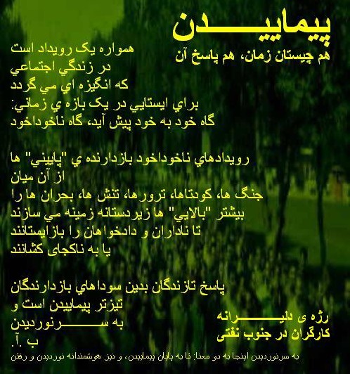 چهار ستون اقتصادي سامانه ولايي که صدها و بلکه هزارها ميليارد دلار سرمايه هاي مردمی را در درازنای چند دهه به جیب زده یا بر باد داده اند، نزديک به هشتاد درصد اقتصاد ايران را زيردست دارند. اين جهار نيرو عبارتند از بازرگانان بزرگ، بنياد-موقوفه خواران فربه، پاسداران بلندپایه، و نوسوداگران مالی-مونتاژی در درون سامانه ی ولايي. دستياران نهان و نانهان برون مرزي آنان نيز بویژه انحصارهاي نفتي-نظامی-مالی بين المللي هستند. سرکوب گستاخانه و خونبارانه ی جنبش هاي زنان و جوانان و روشنگران، و ویژگان کارگران و مزدبگبران و رنجبران، از سوی "خلفای نفت ایران" پوششي است براي اين چپاول کم پیشنه و همه سويه